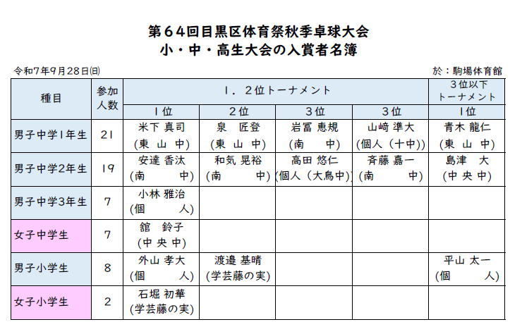 8 | 2025年9月14日 | (日) | 目黒卓球選手権 | ![]() |